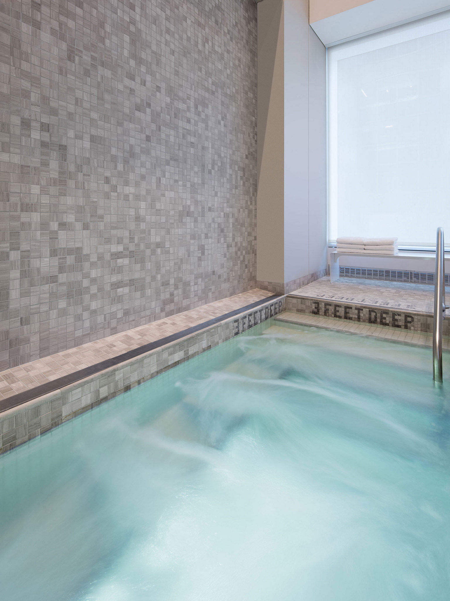 A labyrinth of spa, sauna, and massage-therapy rooms gives way to a <span class="visible-xs-inline visible-sm-inline visible-md-inline visible-xl-block"></span> soaring double-height bathing space. At 75 feet long and 186 feet above ground, <span class="visible-xs-inline visible-sm-inline visible-md-inline visible-xl-block"></span> the pool provides a tranquil swim with city views and abundant natural light. Private and group aquatic sessions are available with personal trainers.